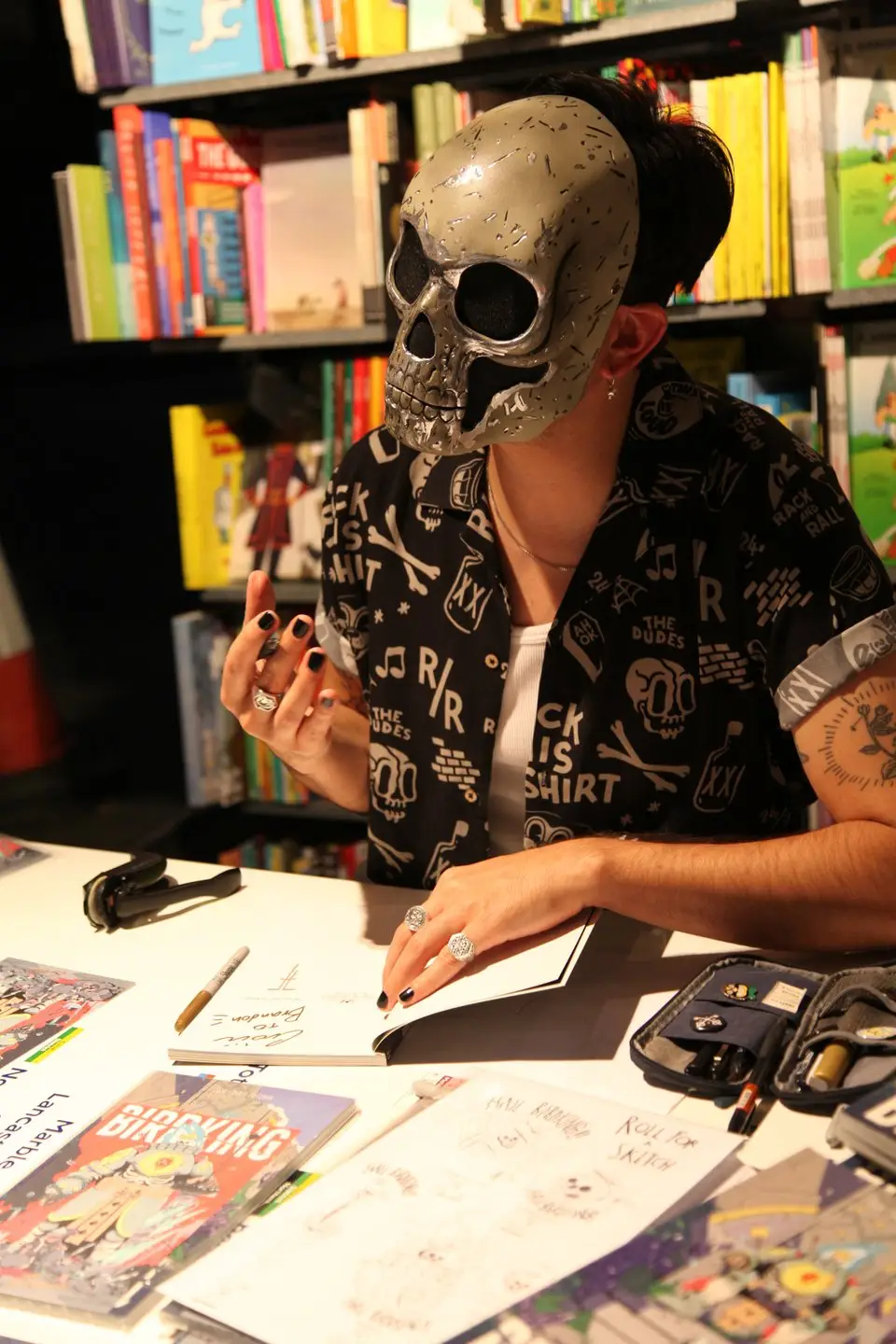 Multifacette Londense artiest die zijn identiteit achter een schedelmasker verbergt, Crom zet zijn talent in op het gebied van uitgeverij, spel, tatoeage en zelfs grafische "necromantie".